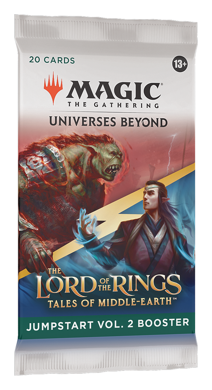 The Lord of the Rings: Tales of Middle-earth™ Jumpstart Vol. 2 Booster Box contains 18 The Lord of the Rings: Tales of Middle-earth Jumpstart Vol. 2 Boosters. Each booster has a theme. Just grab two packs and shuffle them together for wild combos and a unique gameplay experience that’s great for a quick game, for long-time fans looking to jump back in, or for a fun way to learn to play. Each The Lord of the Rings: Tales of Middle-earth Jumpstart Vol. 2 Booster contain 20 Magic cards (including all the lands you need to play). In every pack, you’ll find 2 Rare cards (1 Rare card designed for Jumpstart boosters and 1 Rare or Mythic Rare from the main set), and 2 Land cards with a shining Traditional Foil treatment.