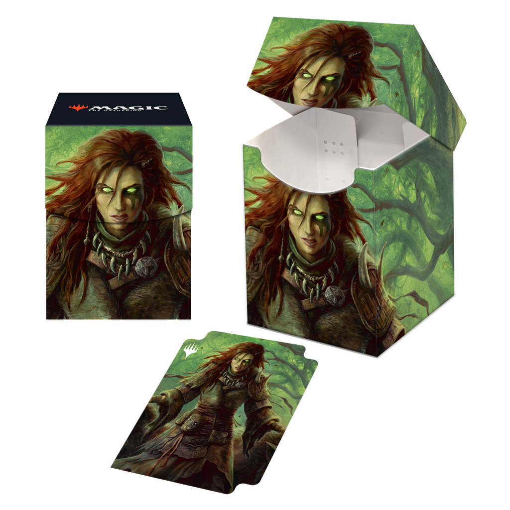 The 100+ Deck Box features vibrant, full-color artwork from Magic: The Gathering and includes a matching deck divider. Made with archival-safe, non-PVC, rigid polypropylene materials, you can store up to 100 double-sleeved cards with confidence. The self-locking lid keeps your cards securely stored when not in use, while also offering easy access. Sized for standard size trading cards.