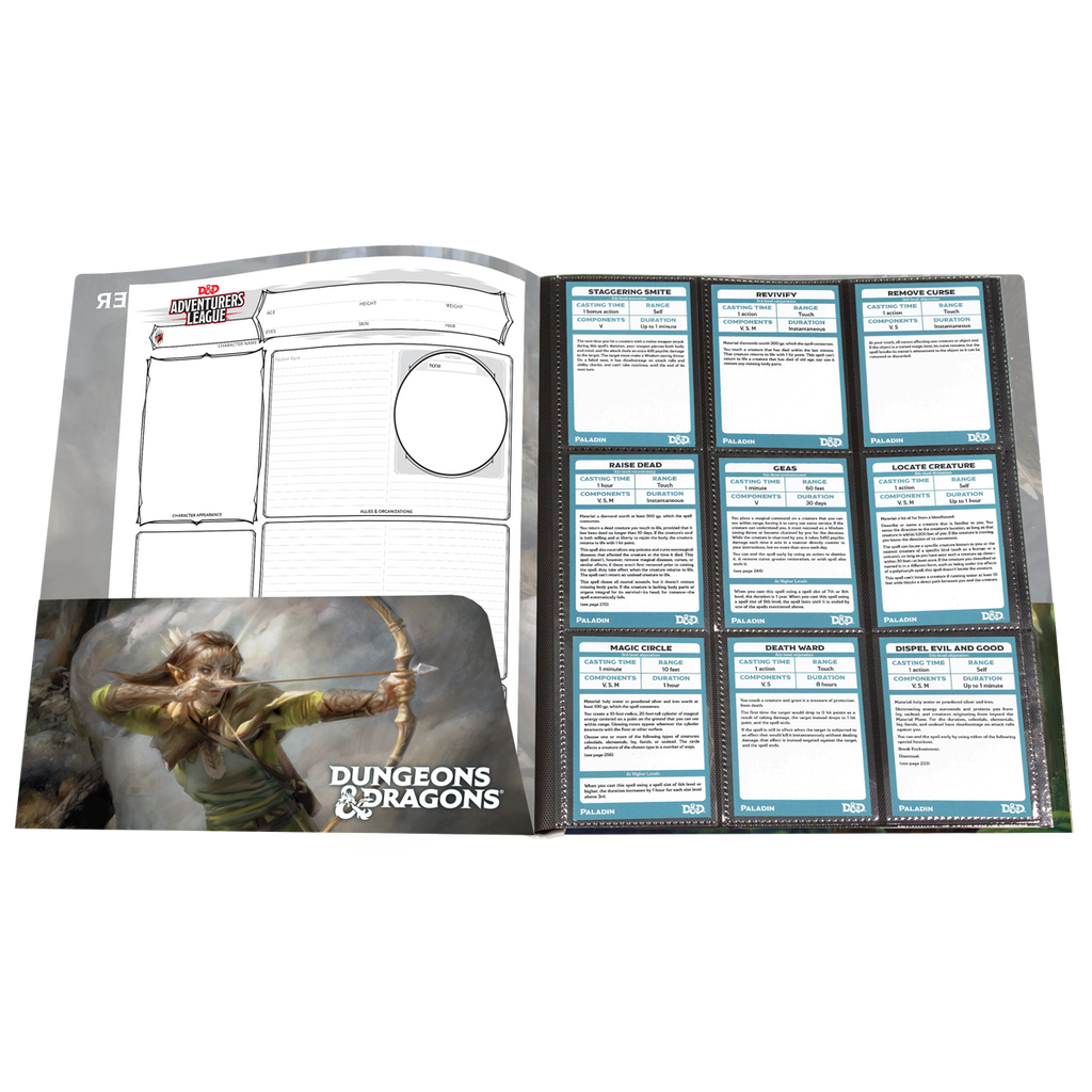 • Includes 10 single-pocket pages for character sheets and notes, and two 9-pocket pages for standard size spell cards