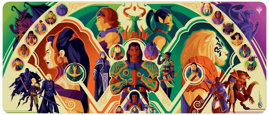 Our "Magic: the Gathering: War of the Spark " Table Playmat is a large 6 ft. long Table Playmat with premium fabric top to prevent damage to cards during game play. Dimensions are approximately 72" X 30". Rubber backing lets the playmat lay flat and prevents the mat from shifting during use.