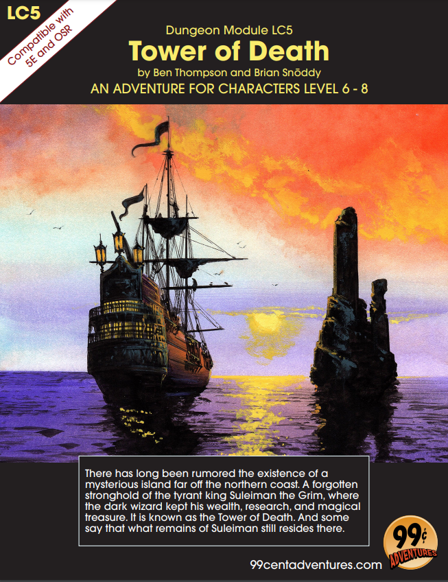 Tower of Death is a self-contained adventure module designed for 4-6 characters, who begin the game uncovering the existence of a mysterious island filled with untold dangers and long-lost treasures. Their journey takes them through a violent pirate city, through treacherous waters, and finally towards the looming spires of the fearsome Tower of Death, ruled by the evil Lich King Suleiman the Grim. Only by battling their way up the tower, navigating dark chambers filled with traps, and squaring off against untold horrors, can the heroes uncover the hidden treasures buried amid the ruins and attain wealth beyond their wildest imaginations.