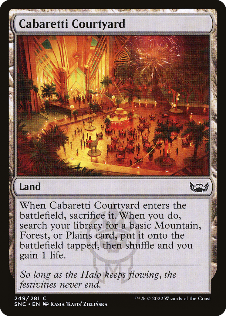 When Cabaretti Courtyard enters the battlefield, sacrifice it. When you do, search your library for a basic Mountain, Forest, or Plains card, put it onto the battlefield tapped, then shuffle and you gain 1 life.