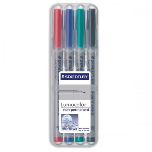 Staedtler Lumocolor non-Permanent Marker Pens pack of 4 red blue green black colour. Permanent dry safe nib cap with clip. stand-up box smudge proof. Medium Nib