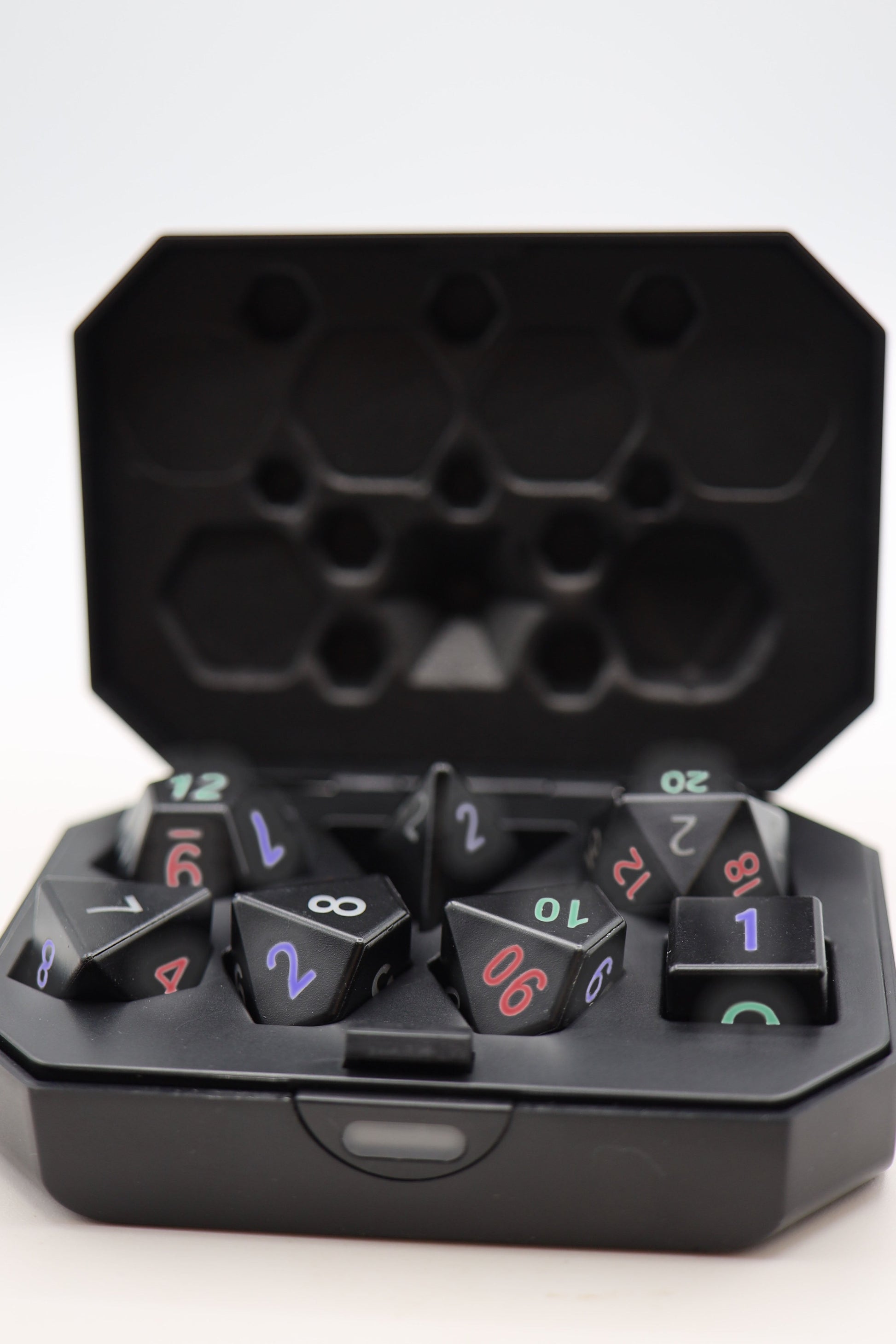 This super cool dice are a matte black until you shake or roll them - they have an action activated led light that blinks various colors for approximately 10 seconds after you roll them.