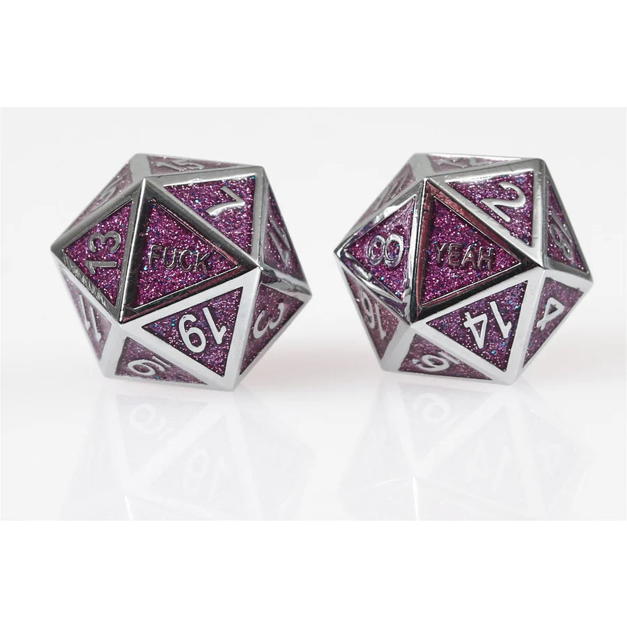- Each set of 2 D20 comes in a custom tin with the 20 replaced with "YEAH" and the 1 replaced with "F***"