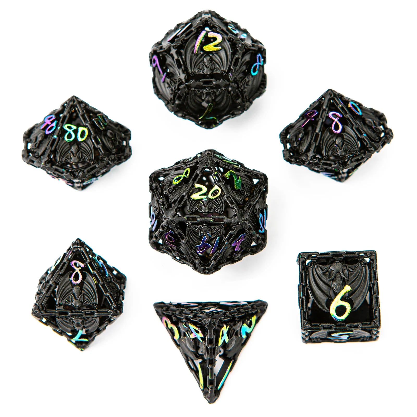 Hymgho Hollow Metal Bat Polyhedral Dice Set - Black with Chromatic Rainbow
