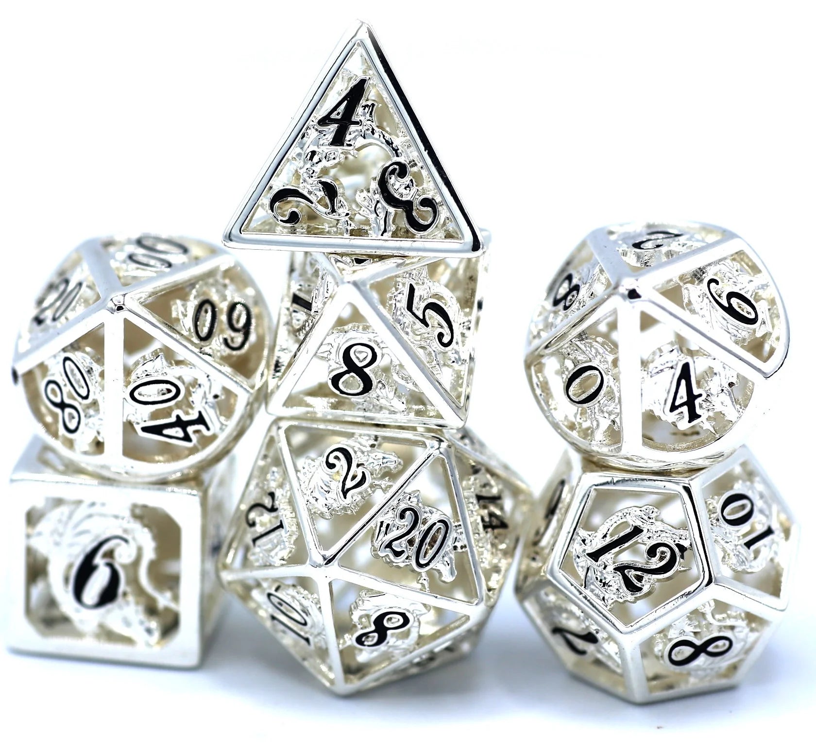 Hymgho Hollow Metal Dice - Shiny Silver With Black Enamel Hollow Metal Dragon Polyhedral Dice Set