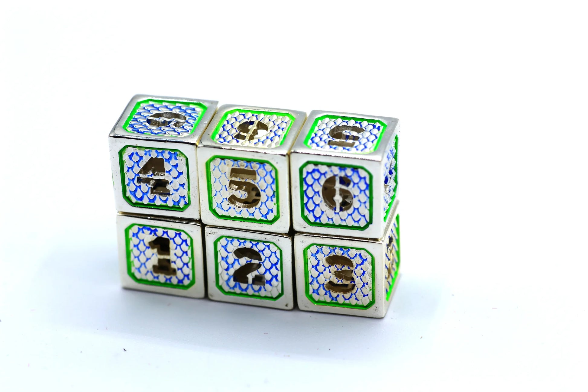 Set of six D6 dice in hollow silver metal with green accents.