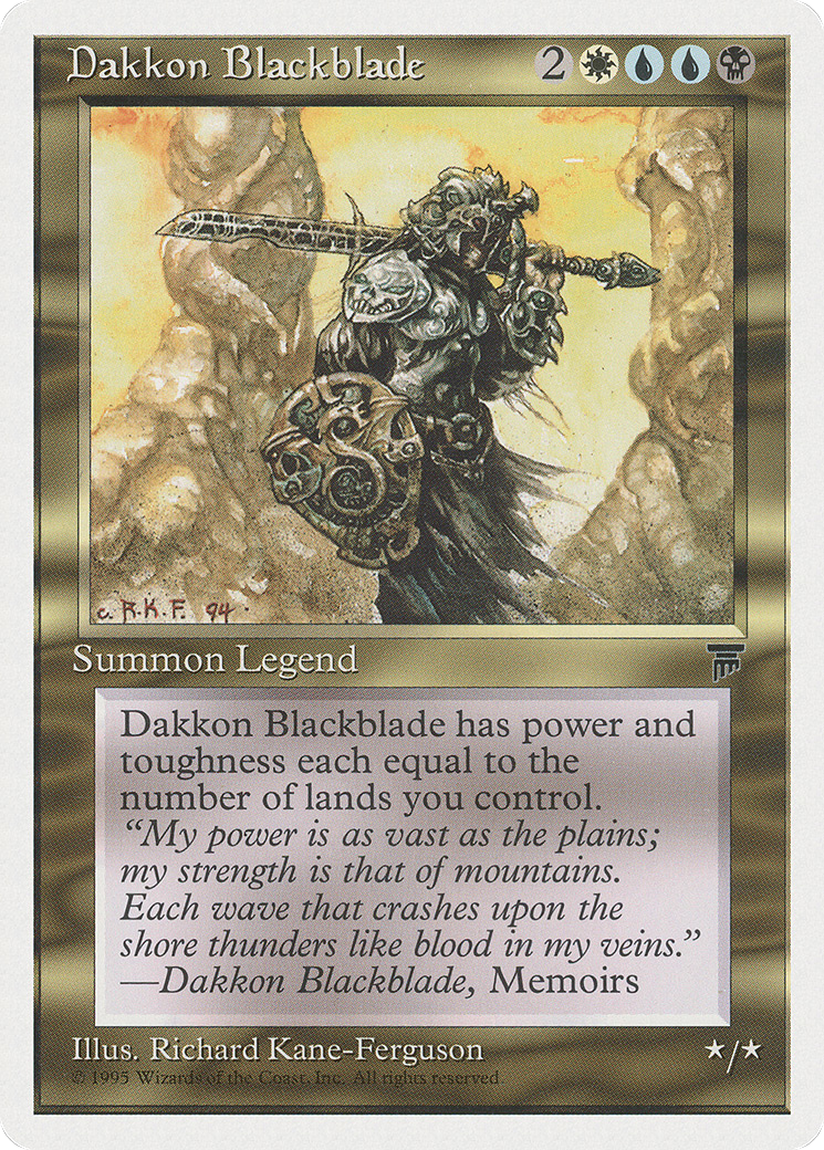 Dakkon Blackblade's power and toughness are each equal to the number of lands you control.