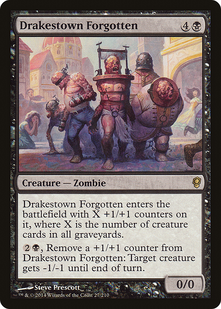 Drakestown Forgotten enters the battlefield with X +1/+1 counters on it, where X is the number of creature cards in all graveyards.