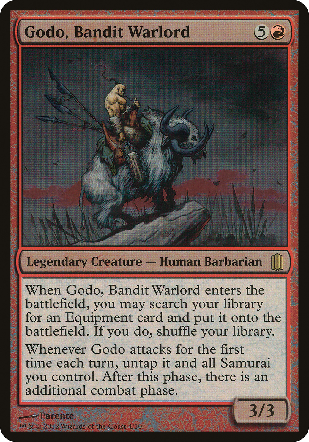 When Godo, Bandit Warlord enters the battlefield, you may search your library for an Equipment card, put it onto the battlefield, then shuffle.