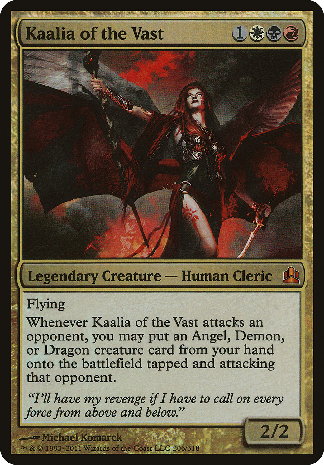 Whenever Kaalia of the Vast attacks an opponent, you may put an Angel, Demon, or Dragon creature card from your hand onto the battlefield tapped and attacking that opponent.
