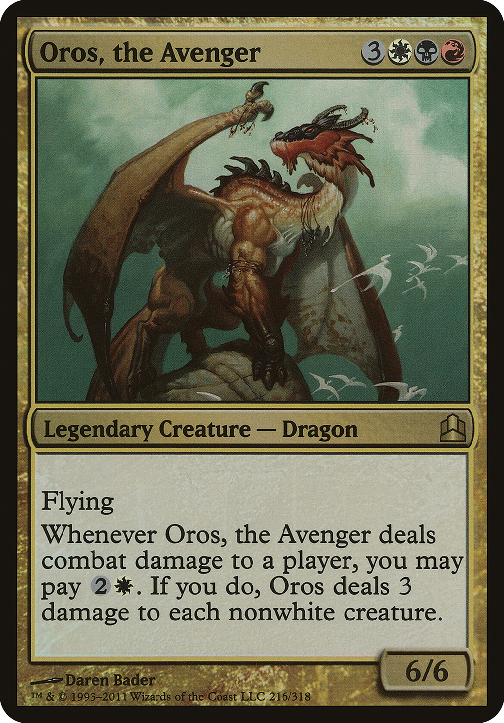 Whenever Oros, the Avenger deals combat damage to a player, you may pay {2}{W}. If you do, Oros deals 3 damage to each nonwhite creature.