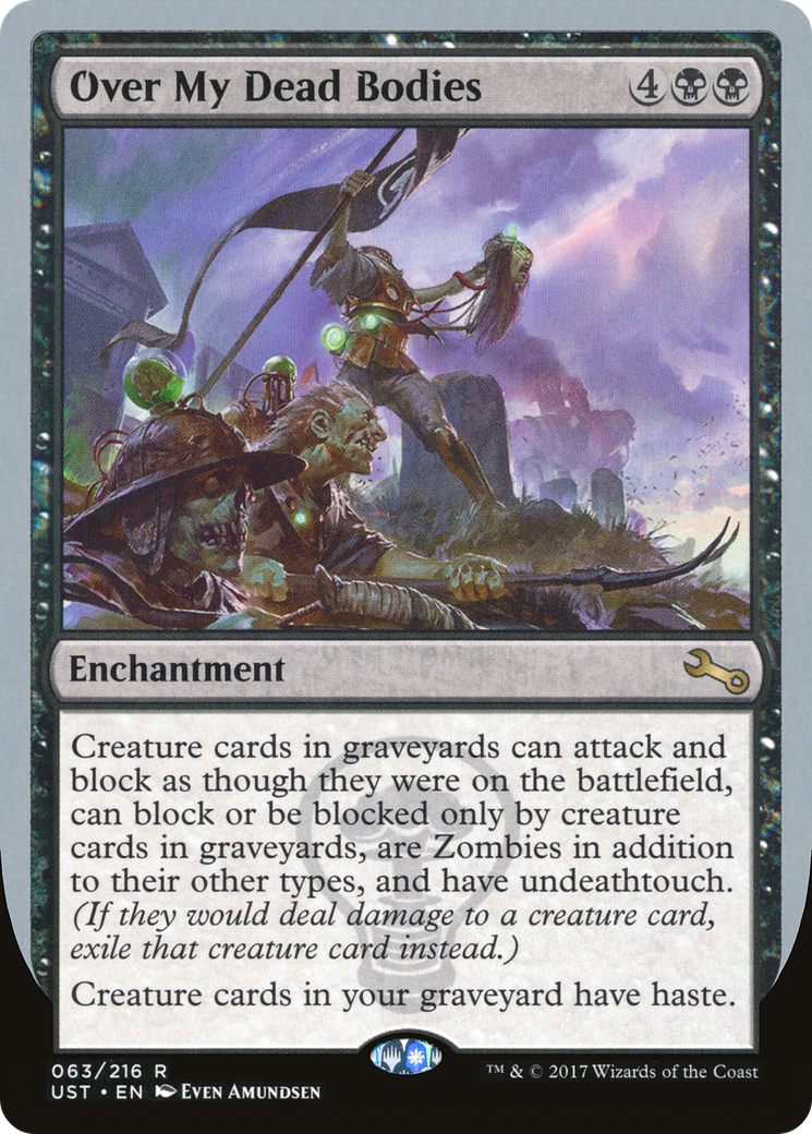 Creature cards in graveyards can attack and block as though they were on the battlefield, can block or be blocked only by creature cards in graveyards, are Zombies in addition to their other types, and have undeathtouch. (If they would deal damage to a creature card, exile that creature card instead.) Creature cards in your graveyard have haste.