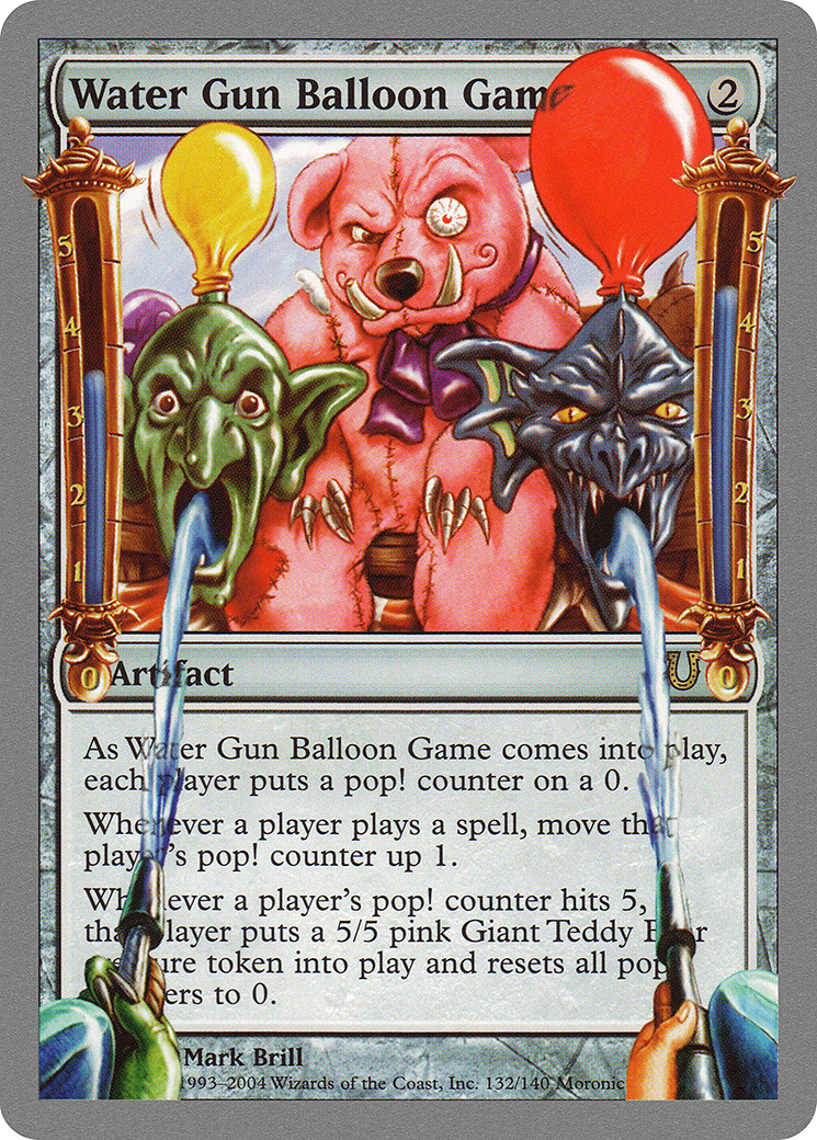 As Water Gun Balloon Game enters the battlefield, each player puts a pop! counter on "0." Whenever a player casts a spell, move that player's pop! counter up one. Whenever a player's pop! counter hits "5," that player creates a 5/5 pink Giant Teddy Bear creature token and resets all pop! counters to "0."