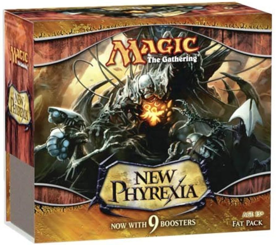 Each New Phyrexia Fat Pack contains: nine boosters, 80 land cards, a Spindown life counter, a player's guide, a card storage box, and two 60-card deck boxes (Contents subject to change)
