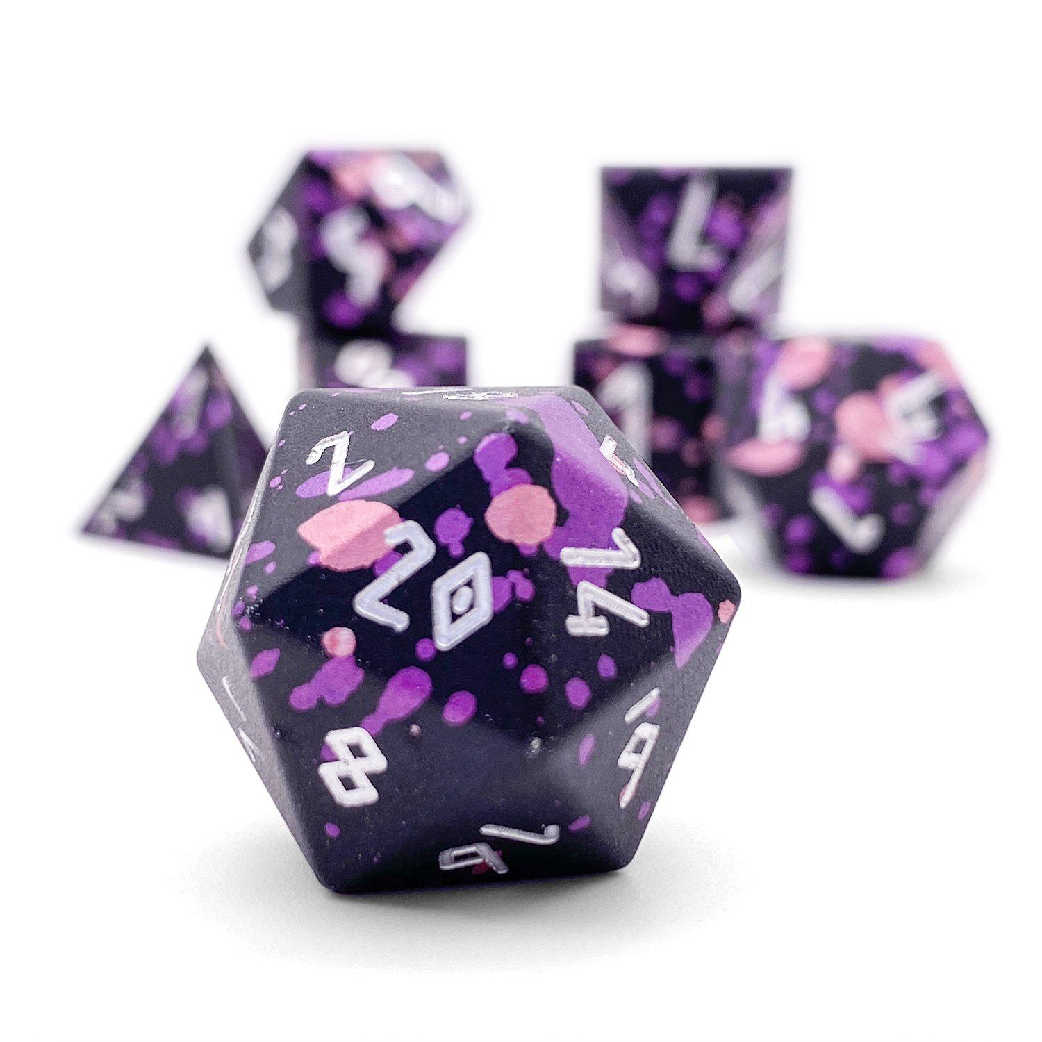 Dark as a chilly, cold night, this polyhedral dice set features a black base with stunning, dark purple and violet splatters. It’s the perfect dice set to have by your side for any dark or spine-chilling campaign.
