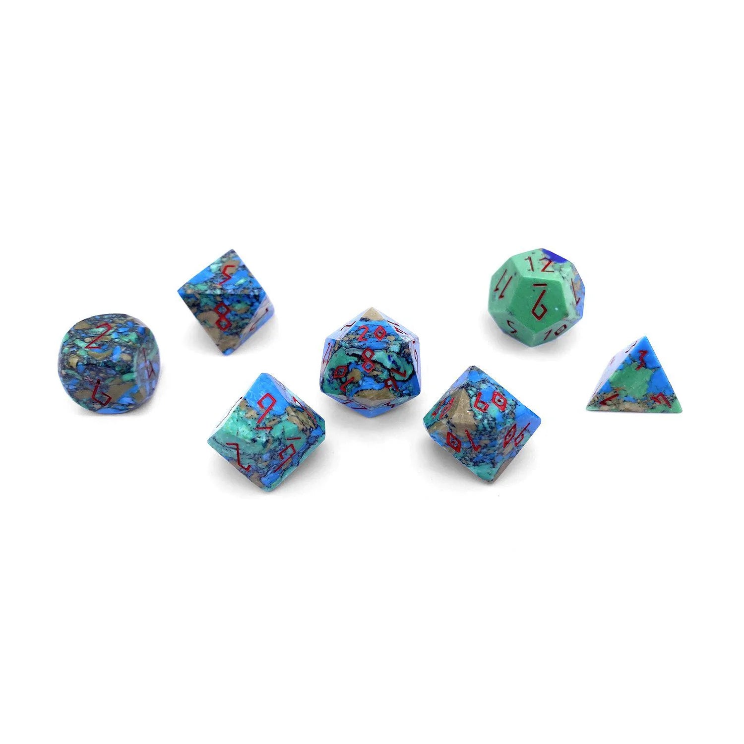 Exclusive Craftsmanship. Handcrafted with a unique attention to detail, our exclusive Gemstone dice set is going to become your most valuable dice set. Each die features a semi-precious stone which adds a touch of opulence and luxury to your RPG games.