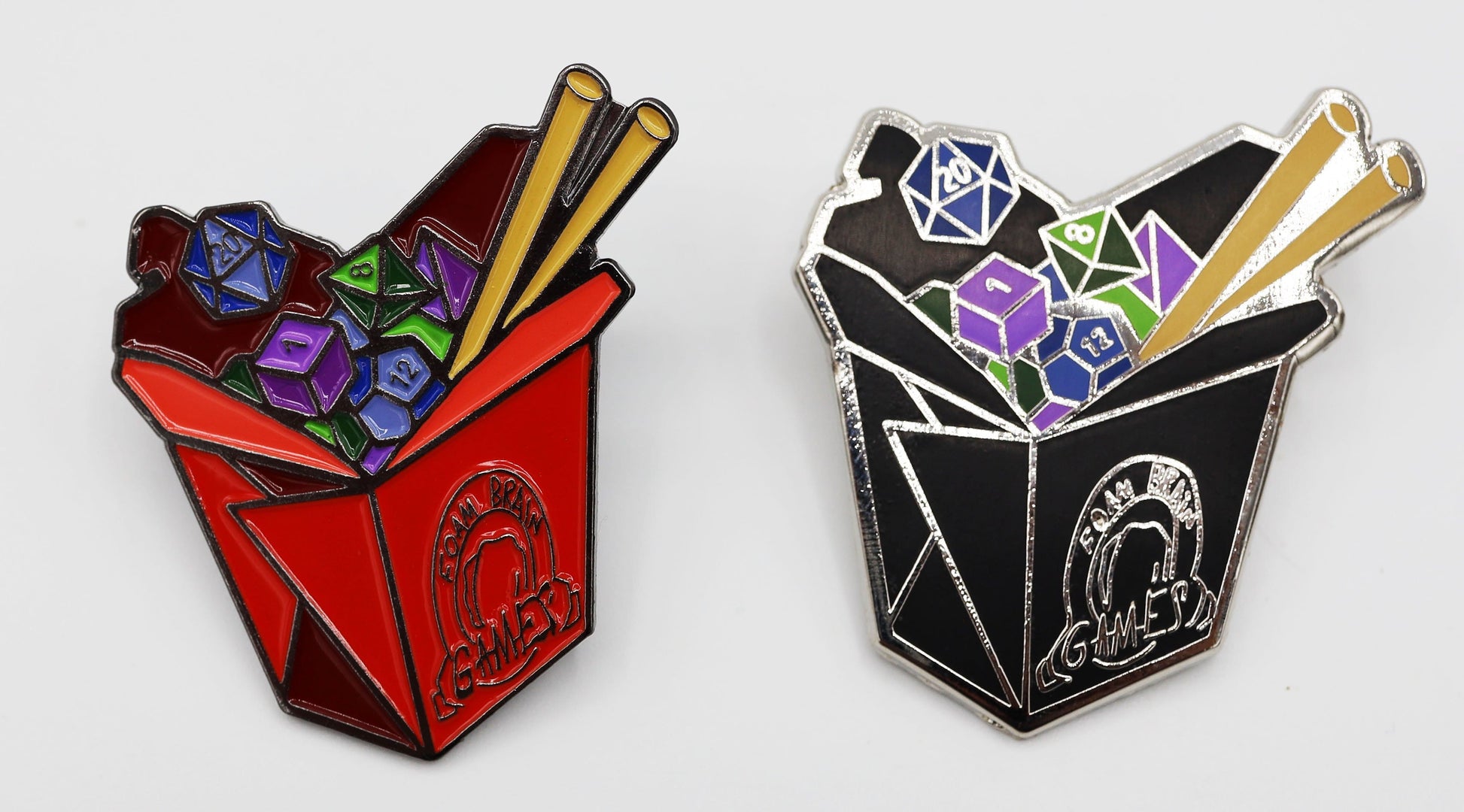 For years, Foam Brain Games packaged mystery dice in black or red Chinese take out containers for sale at conventions. They were such a hit that we decided to make an homage to the 'mystery dice box' in the form of an enamel pin.