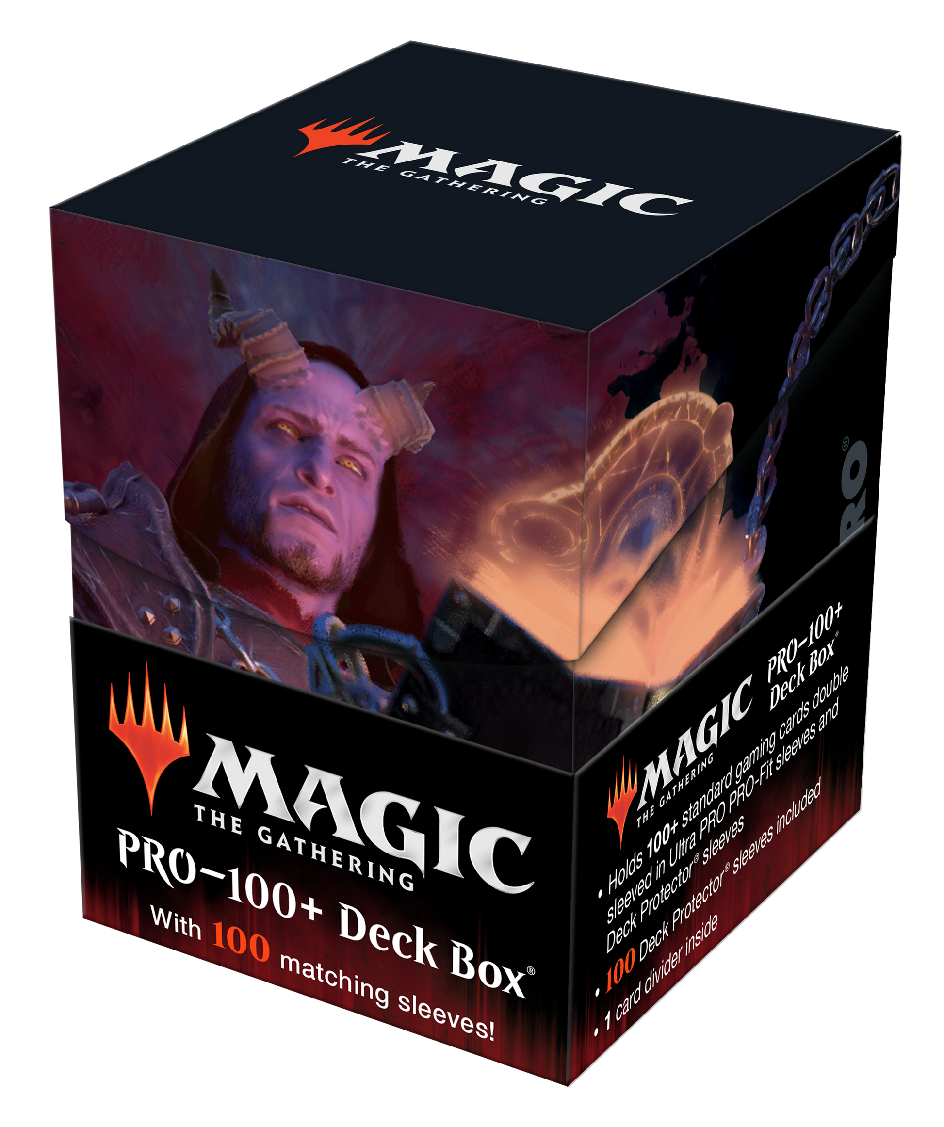 The Commander Combo Box includes 100 Deck Protector sleeves, a 100+ Deck Box, and a deck divider, all featuring matching artwork from Magic: The Gathering. The sleeves are made using Ultra PRO's proprietary ChromaFusion™ technology to minimize delamination, and the 100+ Deck Box and divider are made from a rigid polypropylene material. All materials are non-PVC and archival-safe to provide premium protection.