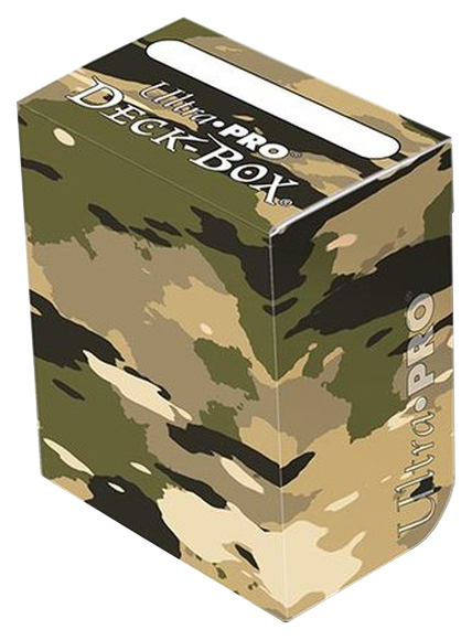 Protect your cards and store them in style with this Deck Box Featuring Camouflage print.. Ultra PRO's Deck Boxes are designed to hold and protect your cards from trading card games. This Deck Box is made from archival-safe polypropylene materials and holds up to 80 standard size cards in Deck Protector sleeves. The box is printed with beautiful full color artwork and comes with a bonus deck divider.