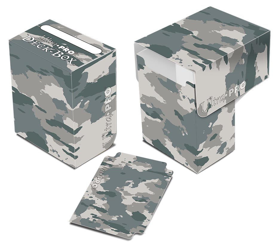 Protect your cards and store them in style with this Deck Box Featuring Camouflage print.. Ultra PRO's Deck Boxes are designed to hold and protect your cards from trading card games. This Deck Box is made from archival-safe polypropylene materials and holds up to 80 standard size cards in Deck Protector sleeves. The box is printed with beautiful full color artwork and comes with a bonus deck divider.