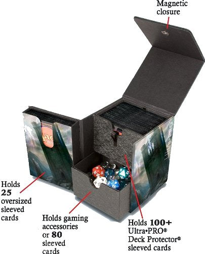 Command Tower with 4-color printed cover. Upper deck compartment holds 100+ sleeved cards, oversize card compartment holds 25 oversized sleeved cards, and removable lower tray holds gaming accessories or 80 sleeved cards. Magnetic closure.