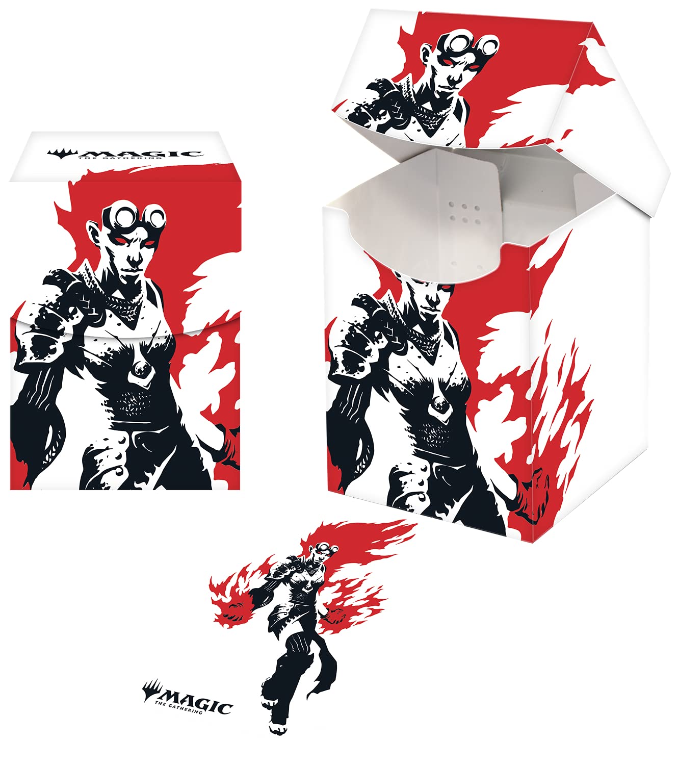 The 100+ Deck Box features vibrant, full-color artwork from Magic: The Gathering and includes a deck divider. Made with archival-safe, non-PVC, rigid polypropylene materials, you can store up to 100 double-sleeved cards with confidence. The self-locking lid keeps your cards securely stored when not in use, while also offering easy access. Sized for standard size trading cards.