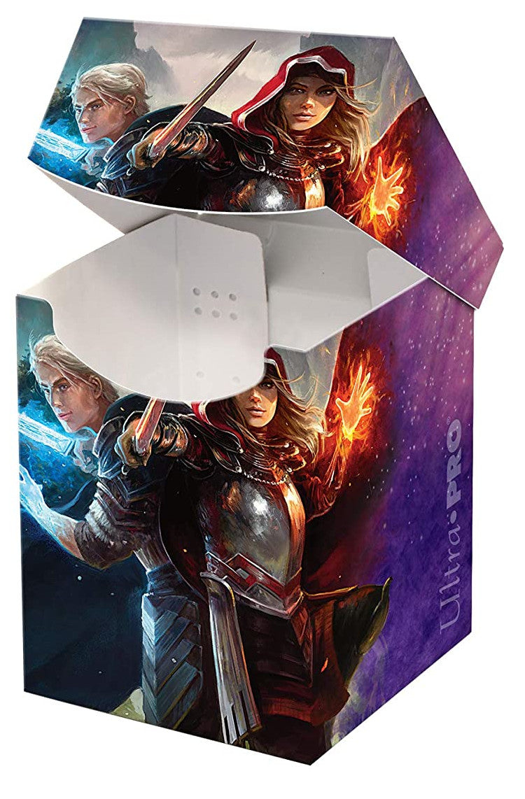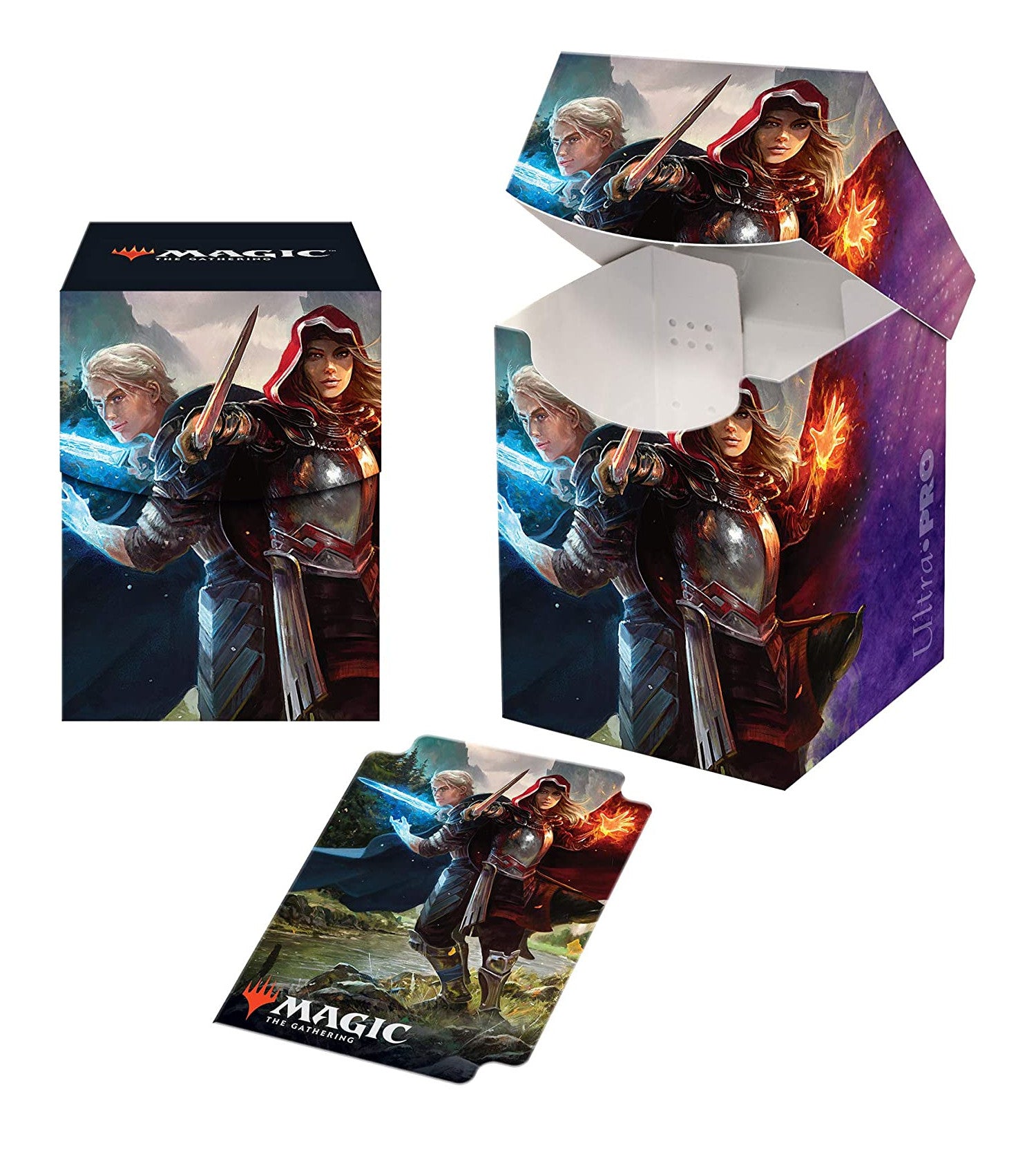 The 100+ Deck Box features vibrant, full-color artwork from Magic: The Gathering and includes a deck divider. Made with archival-safe, non-PVC, rigid polypropylene materials, you can store up to 100 double-sleeved cards with confidence. The self-locking lid keeps your cards securely stored when not in use, while also offering easy access. Sized for standard size trading cards.