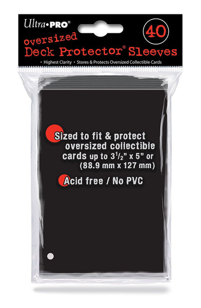 Black Deck Protectors sized to fit oversized collectible cards up to 3-1/2" X 5" cards with Ultra PRO's hologram quality seal. Stores and protects standard sized cards.