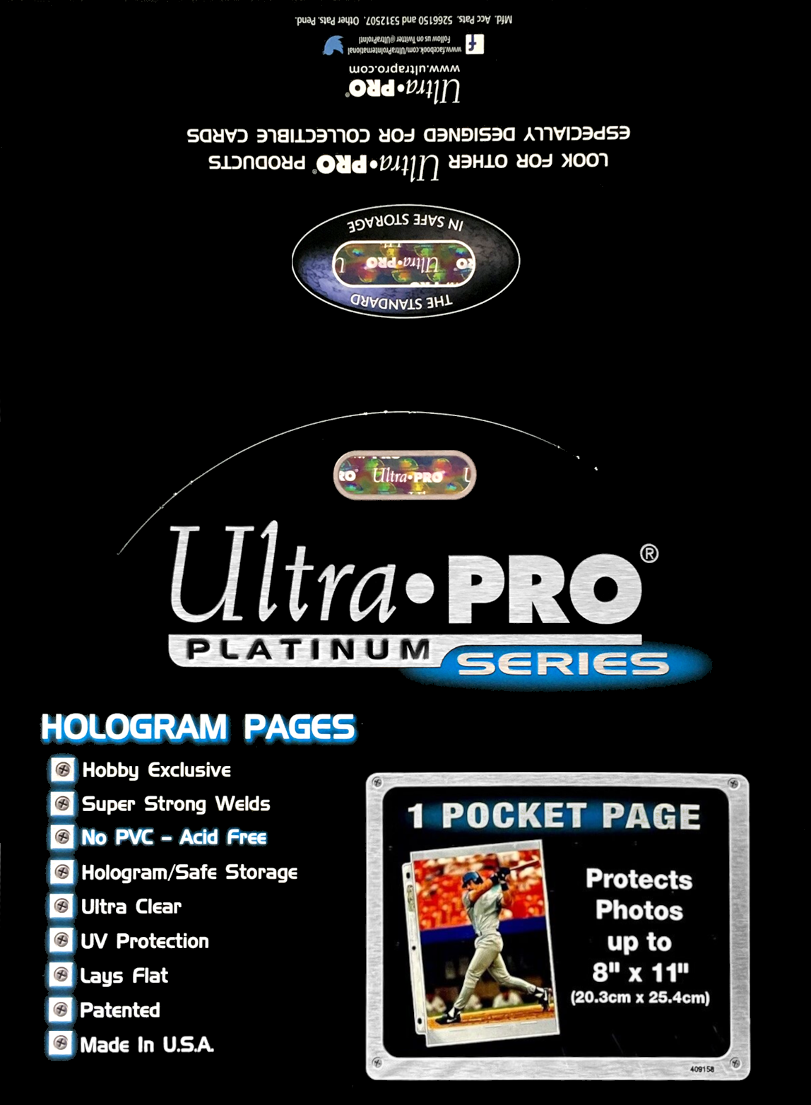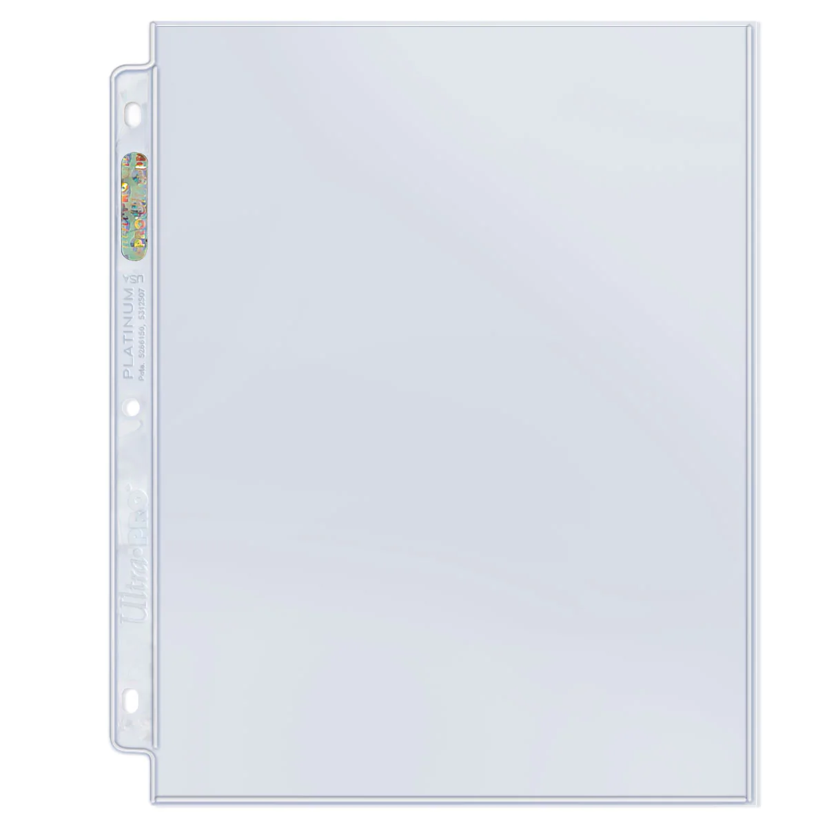 As Ultra PRO's flagship line storage pages, these Platinum Series pages are the premier choice for collectible trading cards, postcards, photos, artist sketch cards, ticket stubs, coupons, and so much more. Each page bears Ultra PRO's hologram quality & authenticity seal on the spine. These pages are 3-hole punched and sized to fit in Ultra PRO's standard-size 3-ring albums.