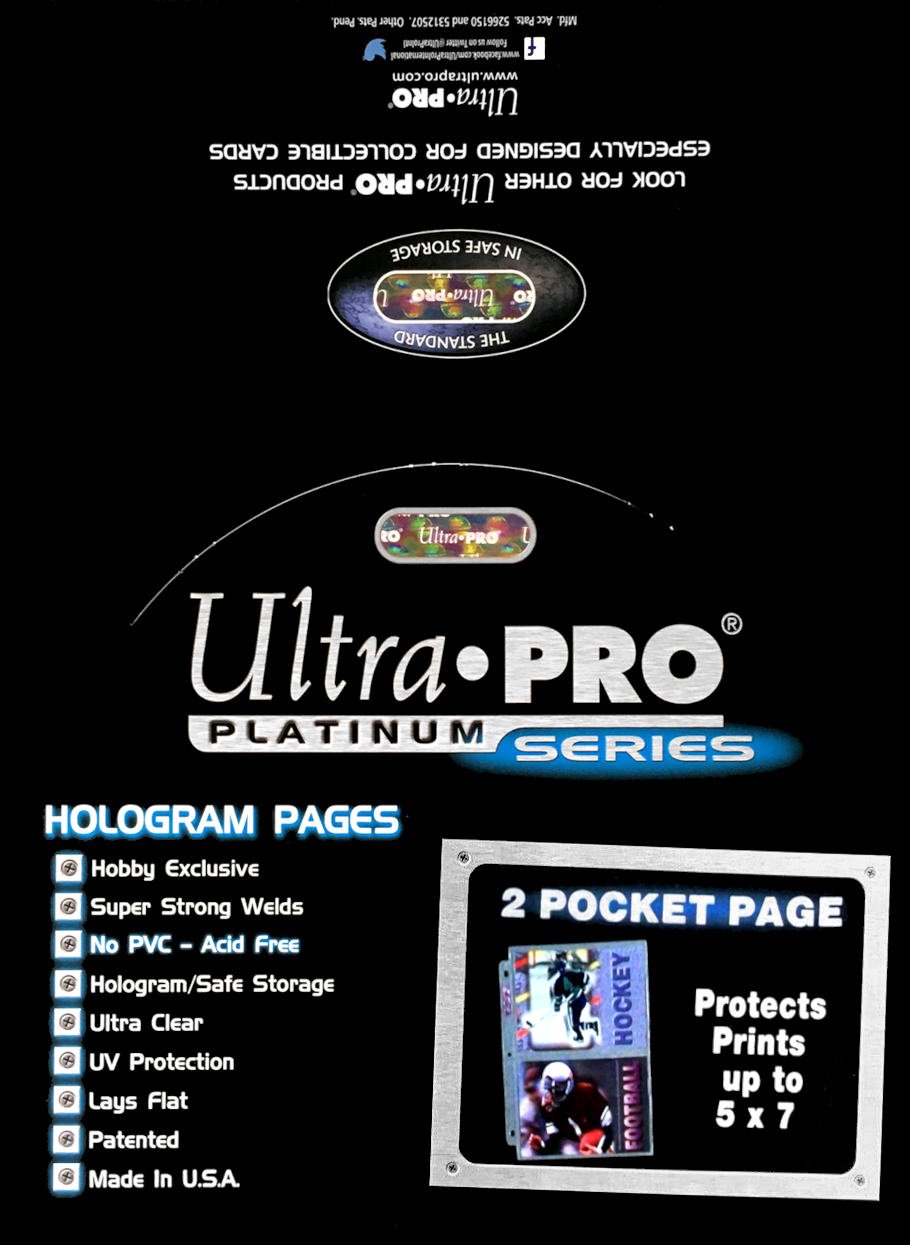 As Ultra PRO's flagship line storage pages, these Platinum Series pages are the premier choice for collectible trading cards, postcards, photos, artist sketch cards, ticket stubs, coupons, and so much more. Each page bears Ultra PRO's hologram quality & authenticity seal on the spine. These pages are 3-hole punched and sized to fit in Ultra PRO's standard-size 3-ring albums.