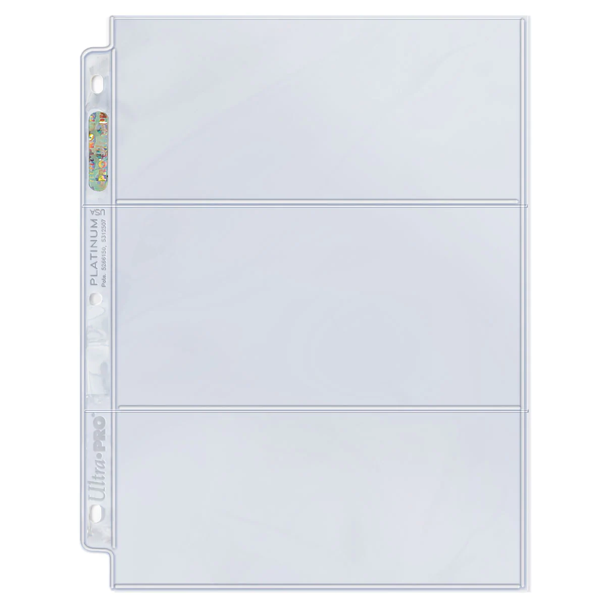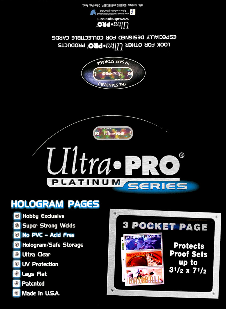 As Ultra PRO's flagship line storage pages, these Platinum Series pages are the premier choice for collectible trading cards, postcards, photos, artist sketch cards, ticket stubs, coupons, and so much more. Each page bears Ultra PRO's hologram quality & authenticity seal on the spine. These pages are 3-hole punched and sized to fit in Ultra PRO's standard-size 3-ring albums.
