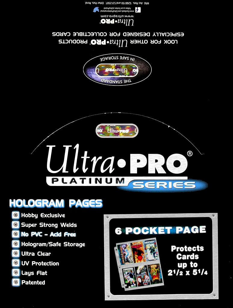As Ultra PRO's flagship line storage pages, these Platinum Series pages are the premier choice for collectible trading cards, postcards, photos, artist sketch cards, ticket stubs, coupons, and so much more. Each page bears Ultra PRO's hologram quality & authenticity seal on the spine. These pages are 3-hole punched and sized to fit in Ultra PRO's standard-size 3-ring albums.
