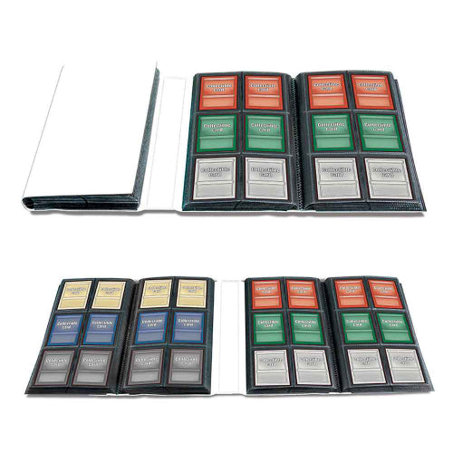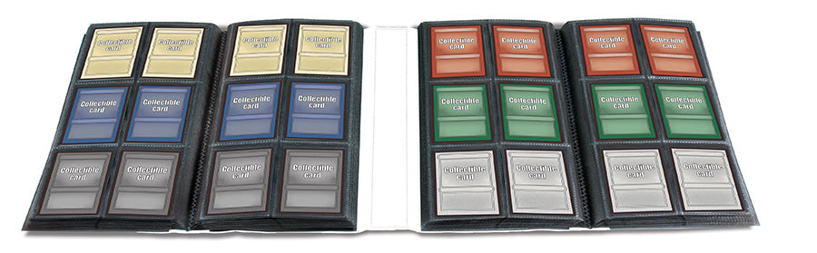 The white 4-Up Playset PRO-Binder designed for collecting playsets of your favorite trading card, features double-fold comact design. Each row holds 4-card playsets. Embossed middle black web material, gives cards a classic framed look. Side loading pocket design to prevent cards from easily falling out. Elastic strap holds the binder shut when not in use. All materials made from archival-safe, acid-free non-PVC material. Sized to fit 480 single-sleeved standard sized cards in Ultra PRO Deck Protector sleeves.
