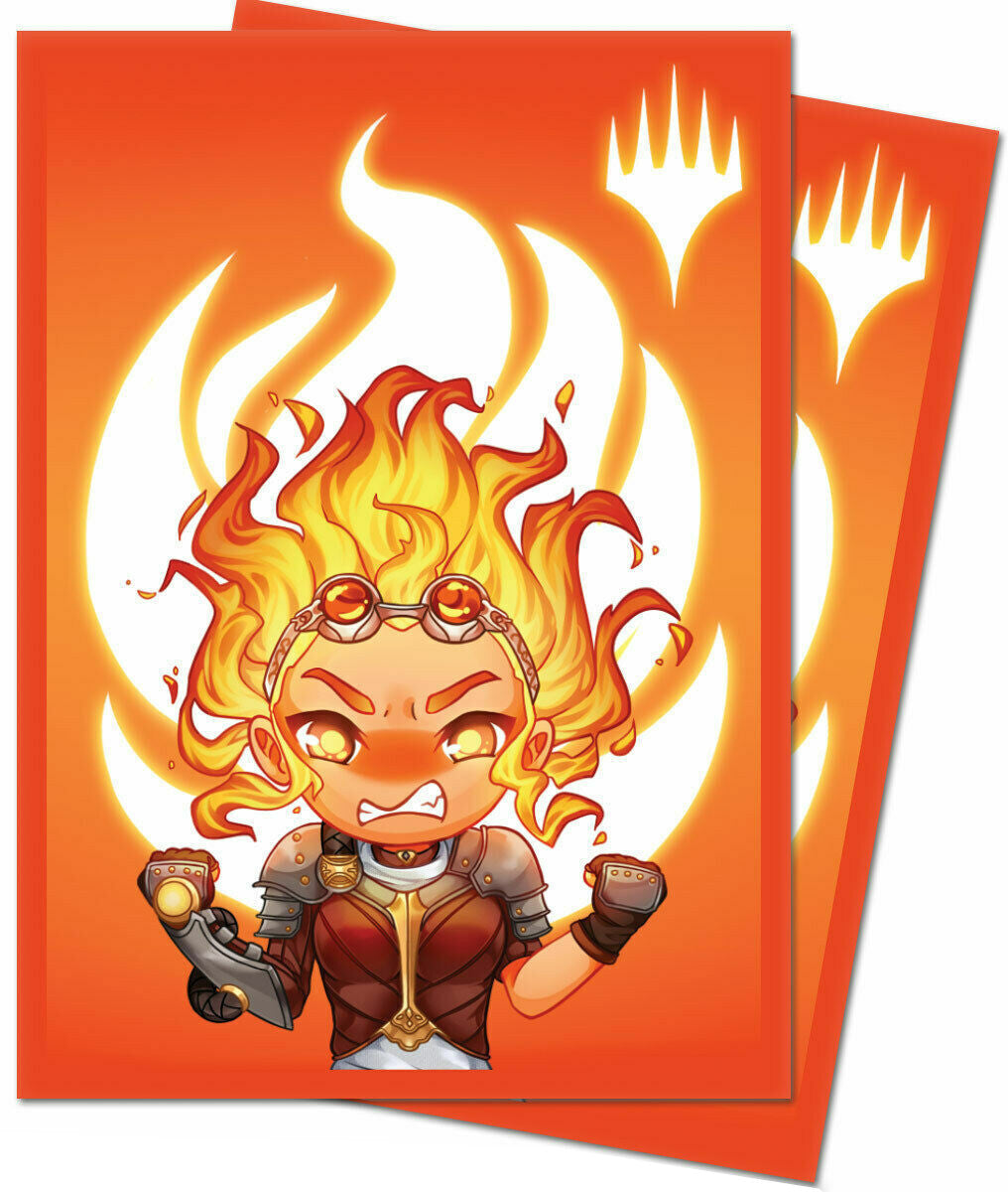 Beware, her power is maximum! New official Magic: The Gathering Deck Protector sleeves featuring Chandra in the adorable Chibi artwork style! Made with archival-safe, polypropylene, non-PVC film, Ultra PRO's Deck Protector sleeves keep your valuable gaming and trading cards safe by providing a protective film layer around your card, keeping it from surface scratches and other wear & tear typically caused by game play. These sleeves are sized to fit standard (Magic) cards with dimensions measuring 2.5" x 3.5". Non-glossy, matte clear film reduces glare on your card face during game play, making these sleeves ideal for on-camera coverage and in bright gaming halls. Made with Ultra PRO's proprietary ChromaFusion technology, these sleeves offer improved seal strength, highly detailed artwork while minimizing delamination. Each pack contains 100 individual sleeves.