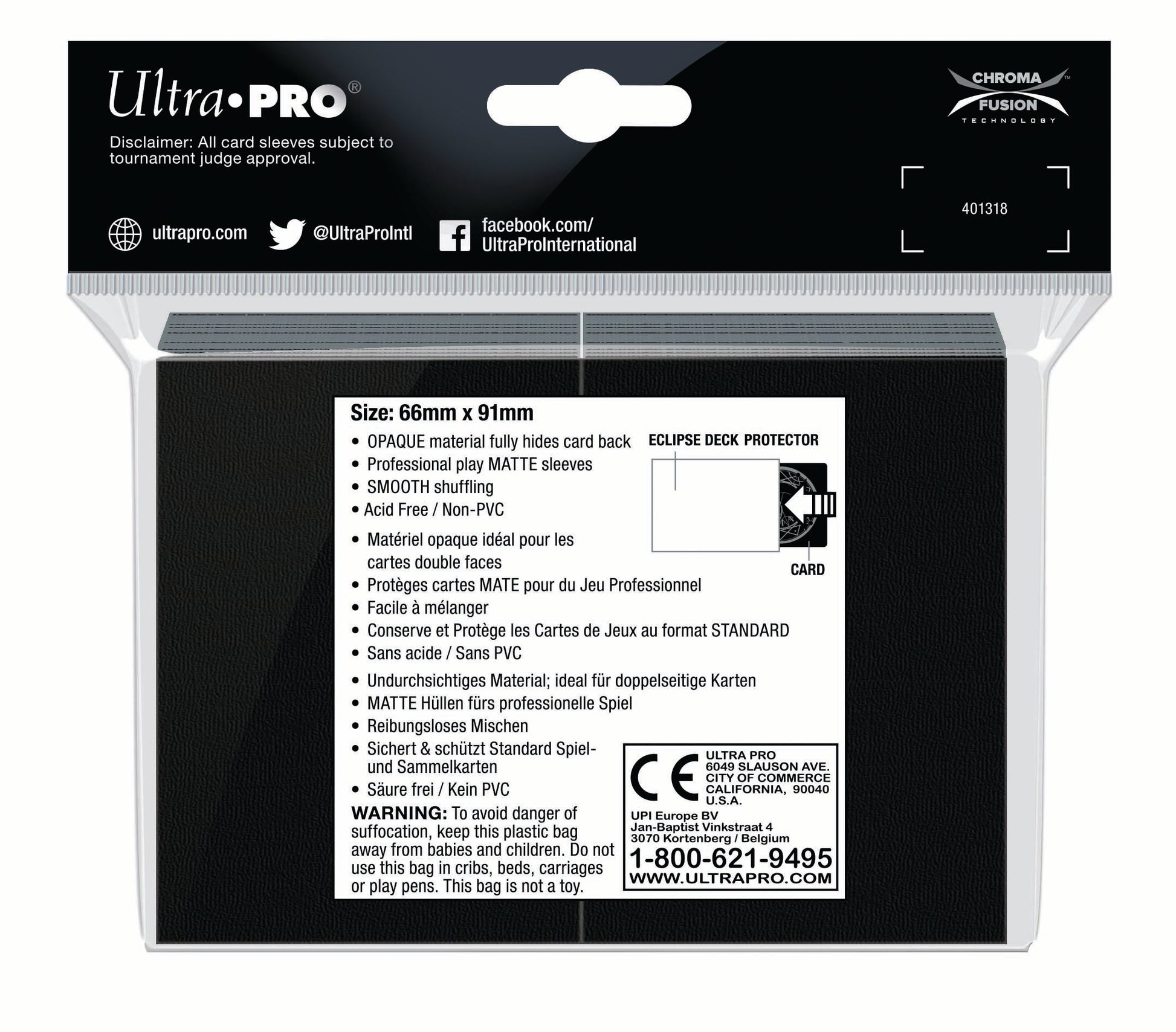 The Eclipse Matte Deck Protector sleeves offer a fully opaque back and glare-free matte card display. With the help of ChromaFusion technology, these sleeves feature an effortless glide shuffle and split-resistant seal, making Eclipse Deck Protectors premium trading card protection. Each pack includes 100 standard sized card sleeves, hand packed and manufactured in California, USA.