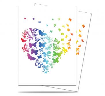 The “Fly Free” Deck Protector sleeve serves as a reminder of the love and acceptance that built our gaming communities. The sleeve is sized for standard size cards, comes in 50-count packs and shows 49 butterflies in a heart-shaped design.